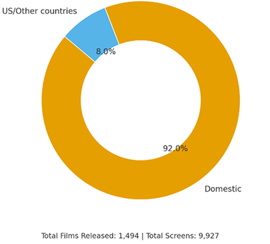 Since India is the world's largest film producer by volume, there isn't a widely recognized national "screen quota" system that explicitly mandates a minimum number of Indian films to be screened in cinemas. The sheer volume of domestic productions and the multi-language nature of the industry generally ensure a dominant presence of Indian films in local cinemas. In 2024, Hollywood and all foreign films only accounted for 8% market share according to data by Ormax Media with domestic films commanding a 92% share. In H1 2025, industry estimates indicated that foreign films could have increased their share to between 10-13% thanks to the strong performance of some Hollywood blockbusters such as Mission: Impossible – The Final Reckoning. In 2019, foreign films had the highest market share ever at 15% thanks to the success of blockbusters like Avengers: Endgame.